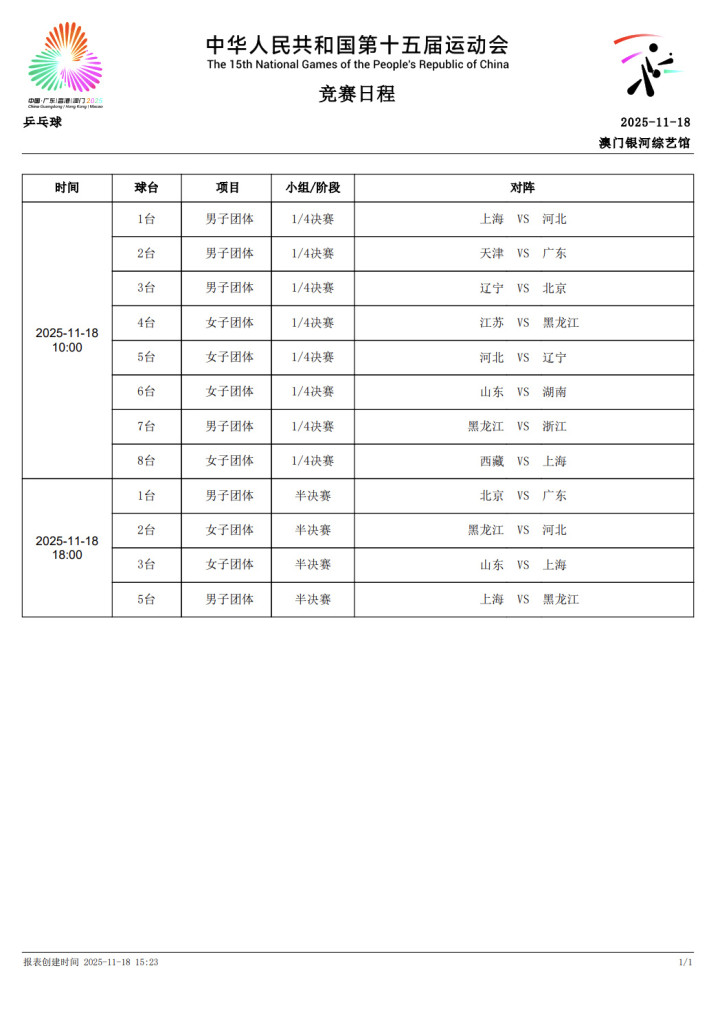 北京时间11月18日,第十五届全运会乒乓球,团体赛四强已经全部出炉,今天晚上将会诞生决赛名单,樊振东所在的上海队与王楚钦、马龙所在的北京队以及林高远所在的广东队,徐英彬所在的黑龙江队将会争夺决赛席位,上海队与北京队有望决赛中相遇。上海队迎战黑龙江队,上海队有樊振东坐镇,而周恺与许昕的男双目前也是保持全胜,而北京队马龙,王楚钦都是奥运冠军而且黄友政也是全国冠军,整体实力的深度很厚实。